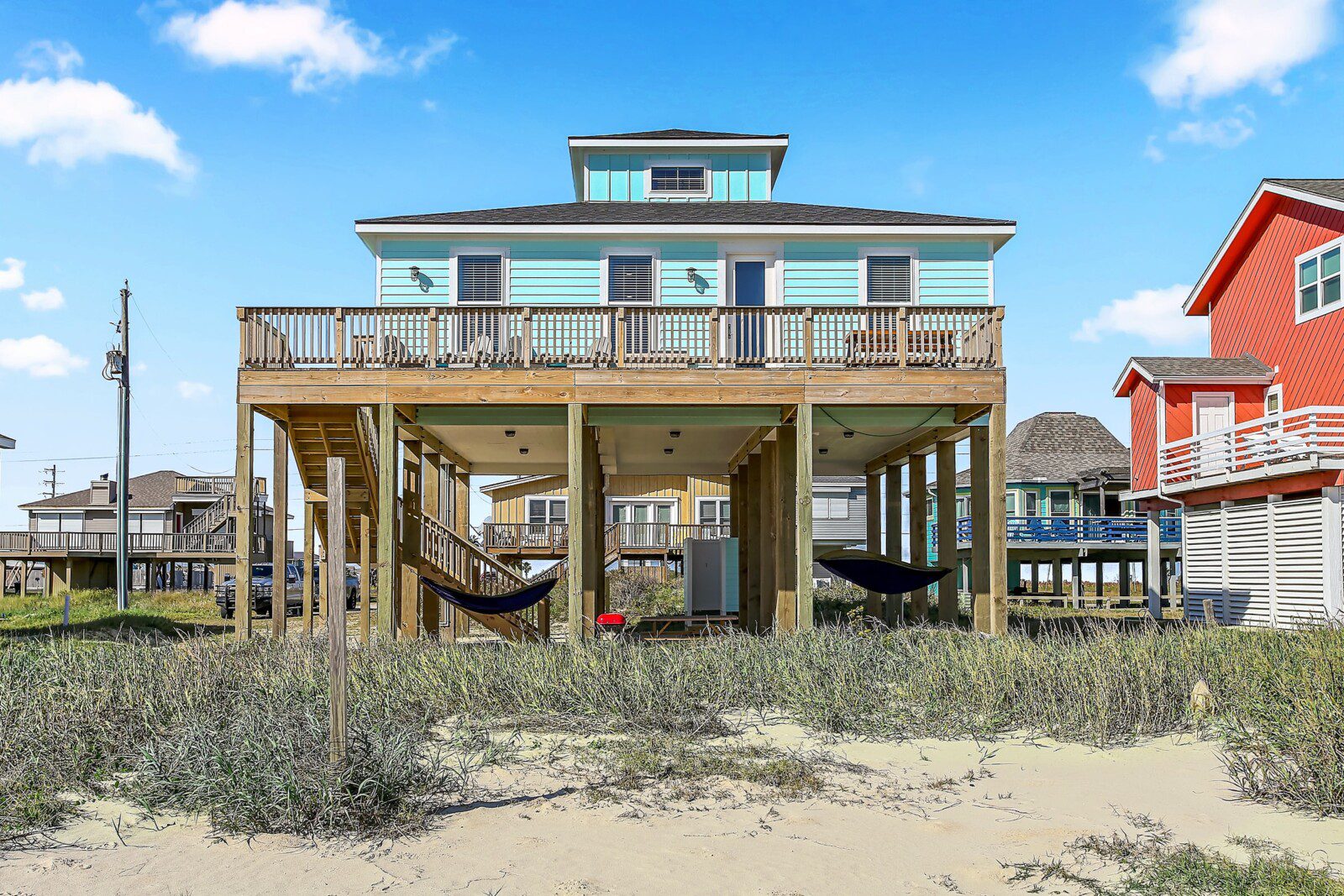 The Salty Dog is perfect for your group or family, offering 4 bedrooms, 2 baths, and a fabulous open floor plan. Located in the fabulous Sea Isle subdivision and right on the beach. The primary bedroom has king size bed with an ensuite bathroom, the 2nd bedroom has a queen-size bed, the 3rd and 4th bedrooms each have two twin bunk beds. On the beachfront deck find lounge chairs and a large table, all overlooking the beach. For your pleasure and fun on the ground level, you will find a bbq grill, picnic table, hammocks, and outdoor shower to rinse off after your visit to the beach. To make sure your feet stay clean, a foot-washing station is located on the upper deck.