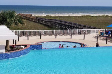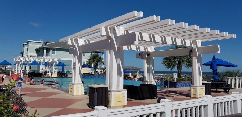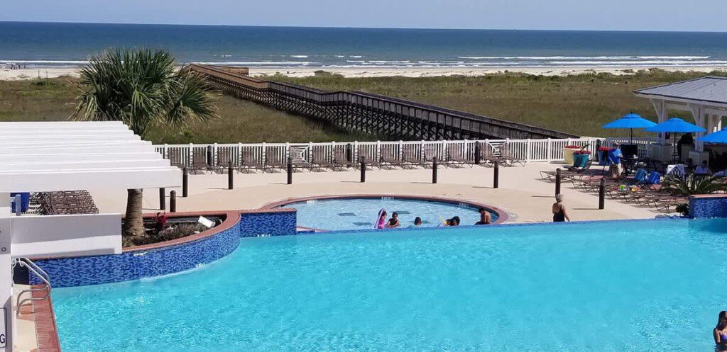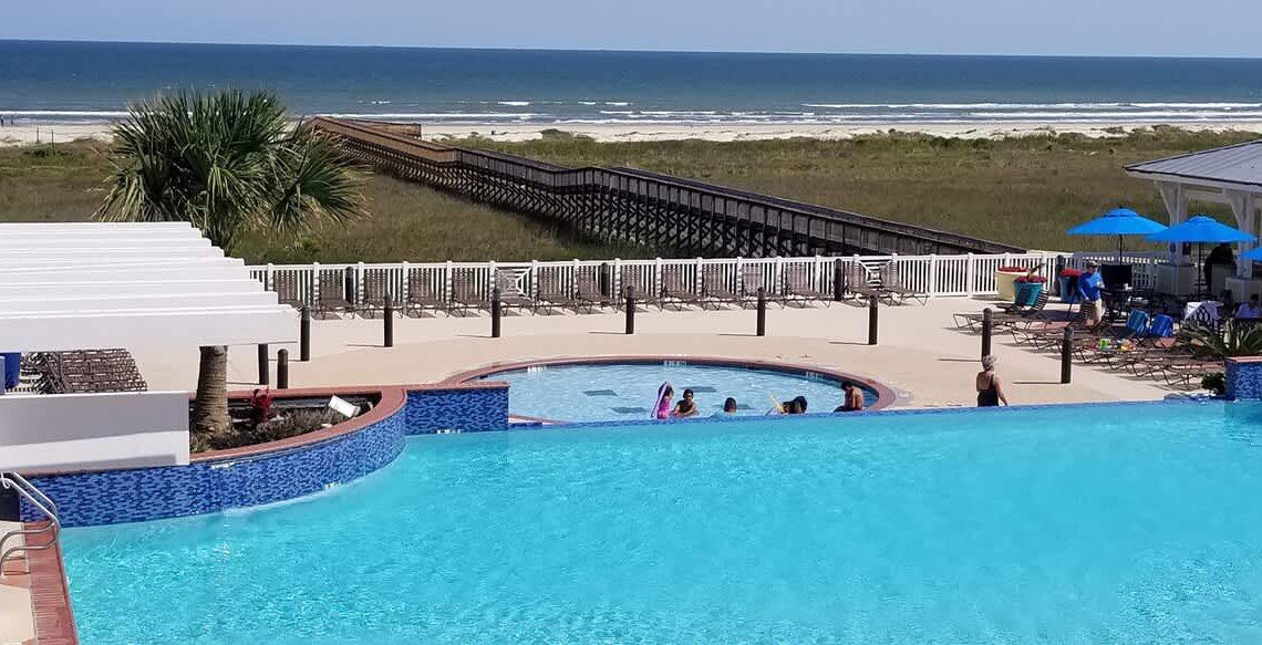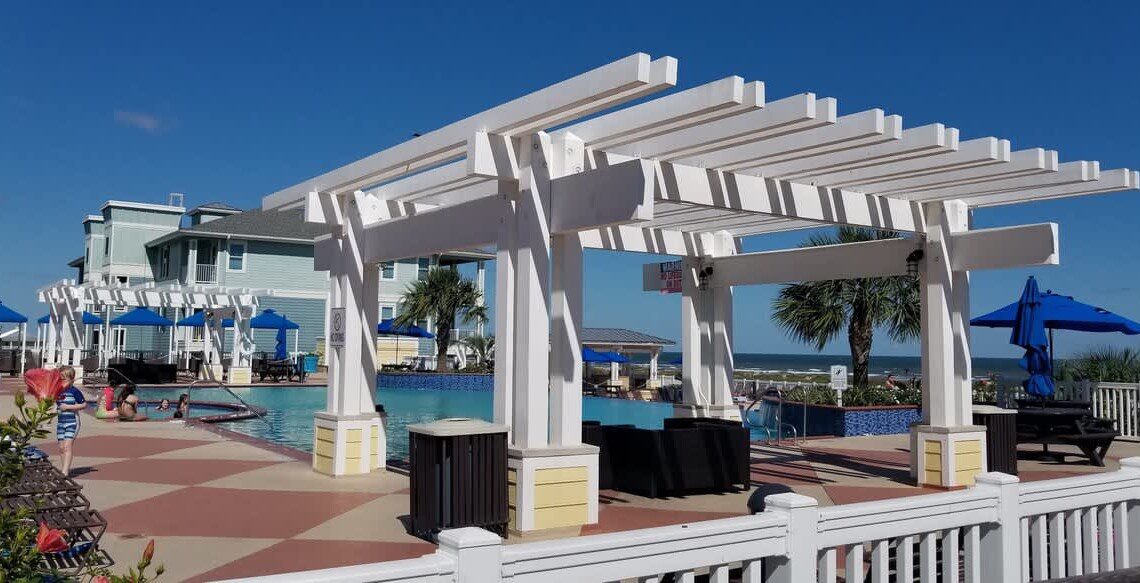 On the bay side you will find our Sunset Pool. It is the place to be with our lazy river and pool, mini shallow area for the little ones, hot tub, fire pit, and grills, this pool is our hidden jewel! Relax and float around the lazy river under the beautiful palms while listening to music and spending time with your